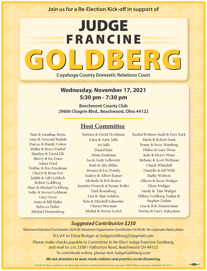 The Committee to Re-Elect Judge Francine Goldberg will hold a Campaign Kick-Off Fundraiser on Wednesday, November 17th, 2021 from 5:30pm-7:30pm at Beechmont Country Club. Click Here to view the invite.